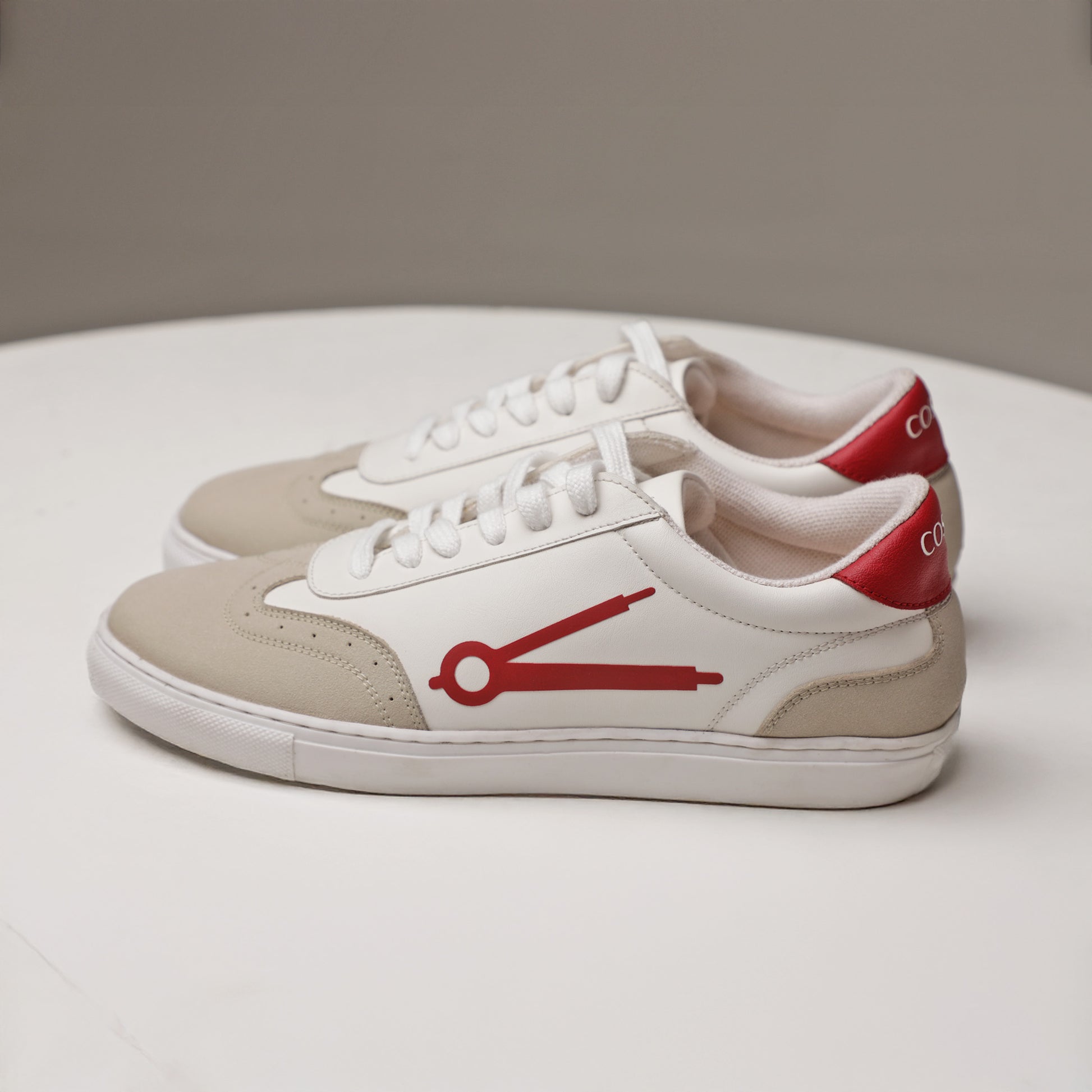 Model: Classic Low-Top Court Sneaker; Upper Material: Plant-based vegan leather with soft suede overlays; Comfort: Padded collar, breathable lining, and a cushioned insole. Branding: Signature COS TAN Compass Logo on the side Sole: Durable outsole for traction and comfort; Lining: Breathable cotton fabric; Sustainability: Ethically made in India using cruelty-free materials and recyclable packaging; Style: Low-top casual sneaker perfect for daily use;
