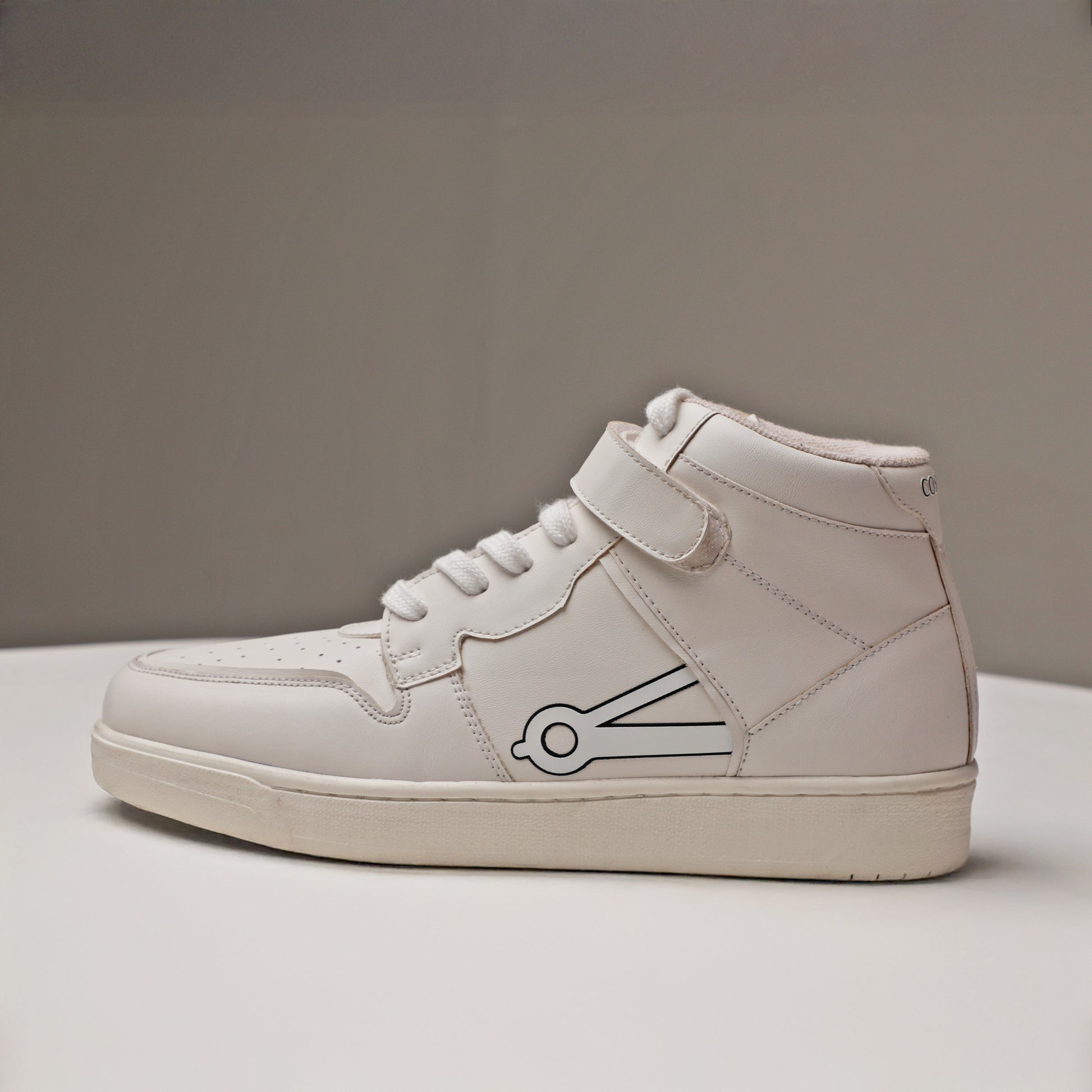 Design Name: COS TAN Peak. Style: High-Top / Mid-Top Court Sneaker. Upper Material: 100% Full Vegan Leather (Durable, easy-to-clean construction). Ankle ClosureTraditional lace-up complemented by a Hook-and-Loop Ankle Strap. Ethics100% Vegan and Cruelty-Free. Comfort/Build: Padded collar/lining for ankle support; cushioned insole; durable rubber outsole. Branding: Signature COS TAN Compass Logo on the side and heel.